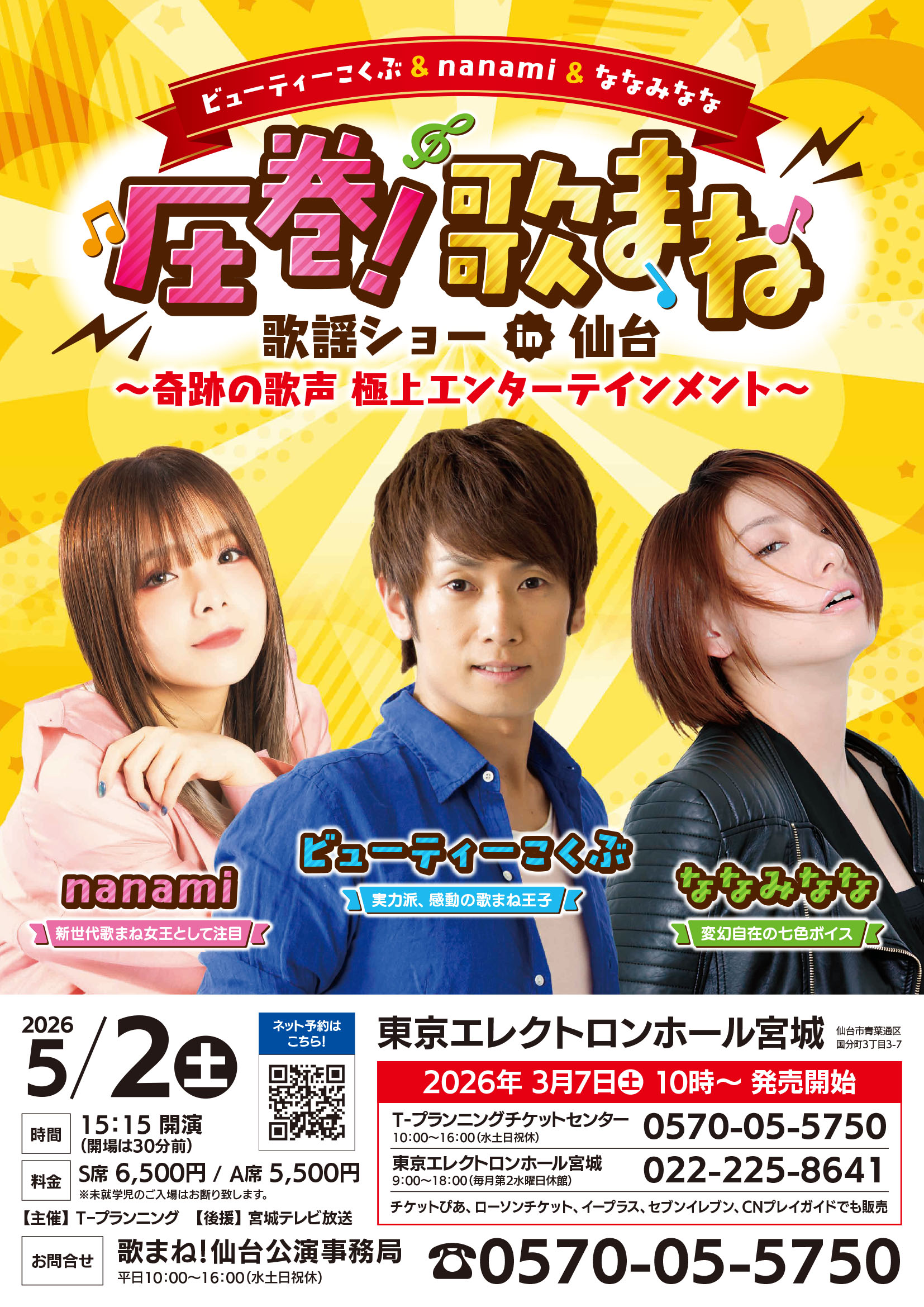 圧巻!歌まね歌謡ショーin仙台~奇跡の歌声 極上エンターテインメント~3月7日(土)午前10時販売開始! S席6,500円、A席5,500円 ※未就学児入場不可令和8年5月 2日(土)開場14:45 開演15:15東京エレクトロンホール宮城歌まね!仙台公演事務局 ☎02570-05-5750(平日10:00~16:00)