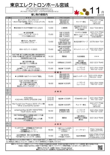 1)掲載内容は10月28日現在の情報です。内容は都合により変更されることがあります。 2)クリックするとPDFファイルが表示されます。 ・ 東京エレクトロンホール宮城の公式X, Facebookも御覧ください。